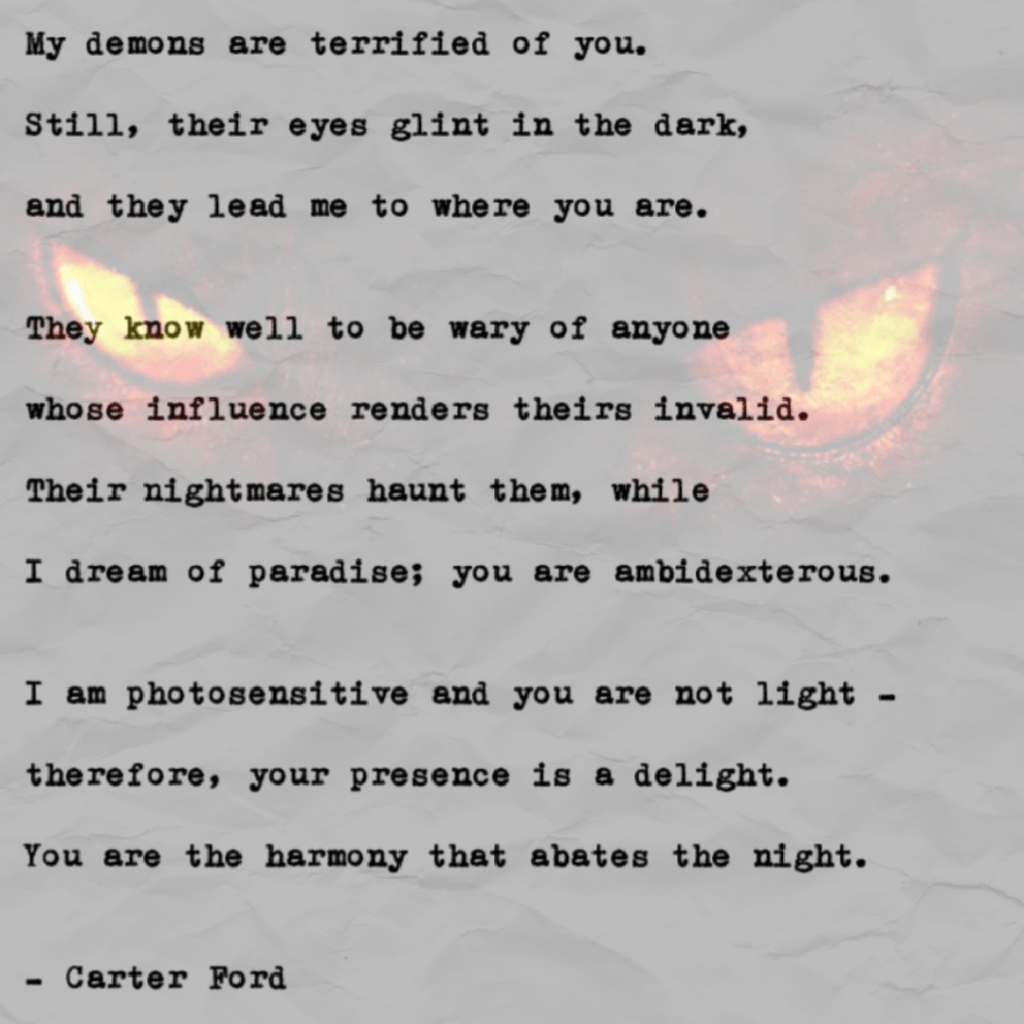 You write beautifully, Carter. The most mundane things sound exotic. Your words carry a beauty all of their own. Each word is a poem. LikeLiked by 1 person Reply